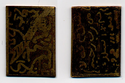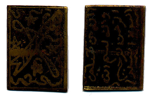 ingot in bronze, with Arabic script, sword design and snake. VF. scarce. |